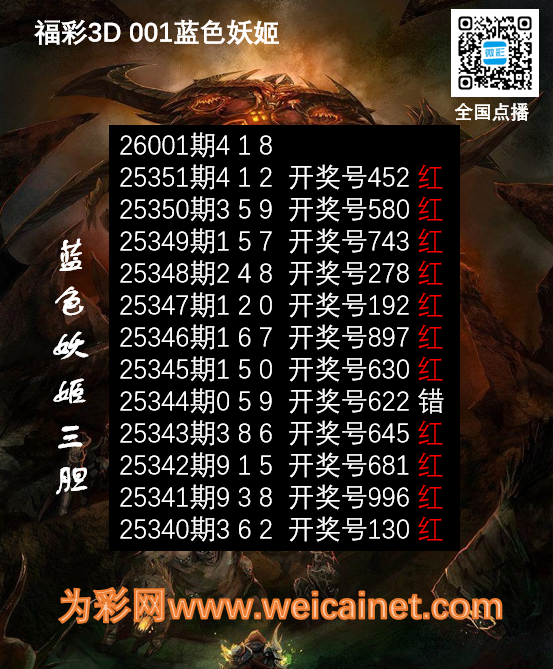 • 福彩3D26001期胆码 蓝色妖姬胆码图