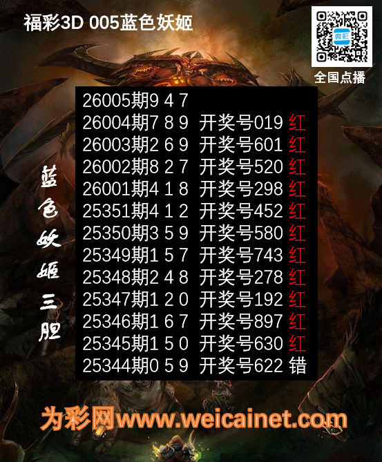 • 福彩3D26005期胆码 蓝色妖姬胆码图