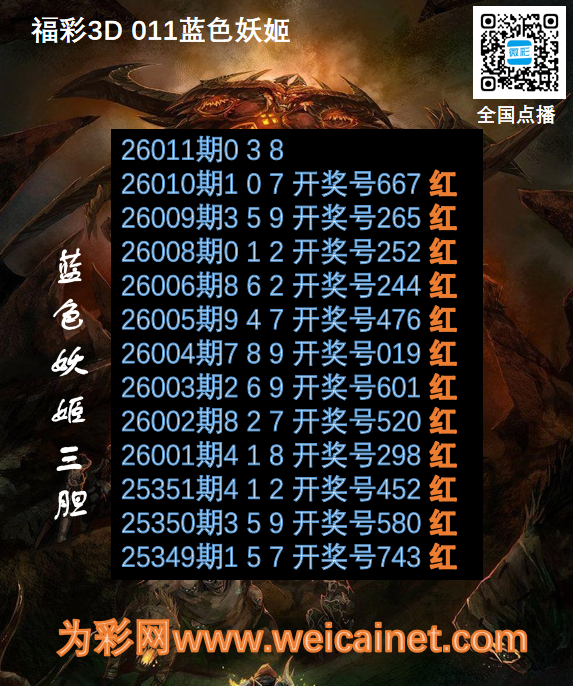 • 福彩3D26011期胆码 蓝色妖姬胆码图