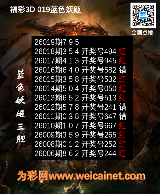 • 福彩3D26026期胆码 蓝色妖姬胆码图