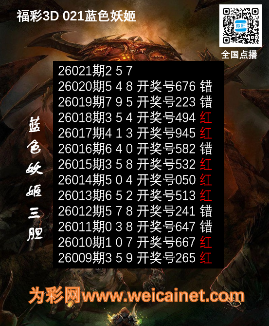 • 福彩3D26021期胆码 蓝色妖姬胆码图