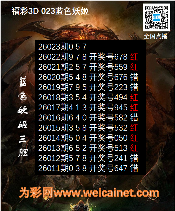 • 福彩3D26023期胆码 蓝色妖姬胆码图