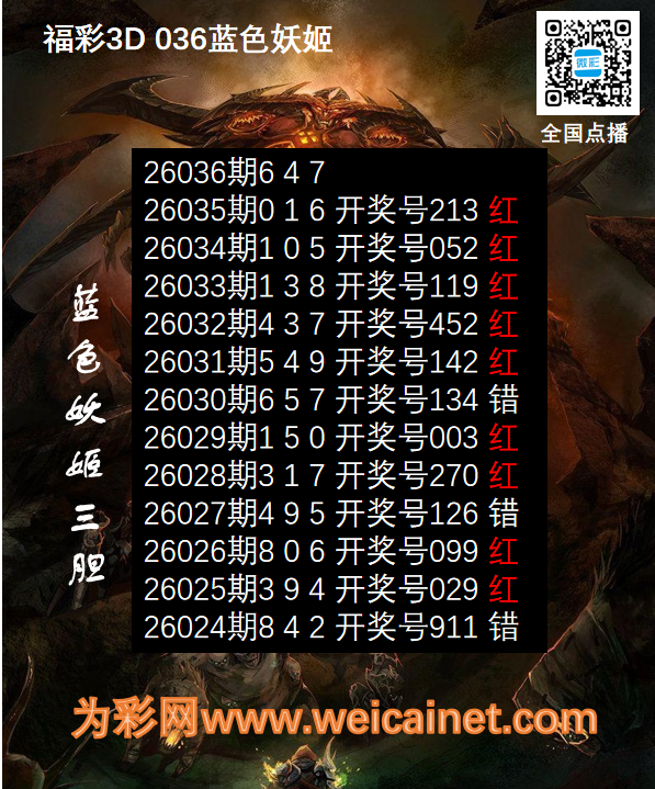 • 福彩3D26036期胆码 蓝色妖姬胆码图