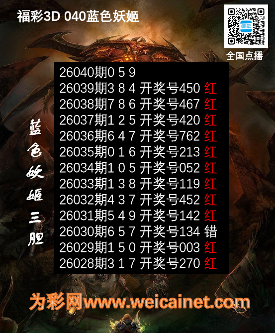 • 福彩3D26040期胆码 蓝色妖姬胆码图