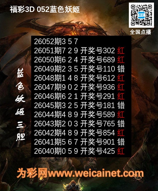 • 福彩3D26052期胆码 蓝色妖姬胆码图