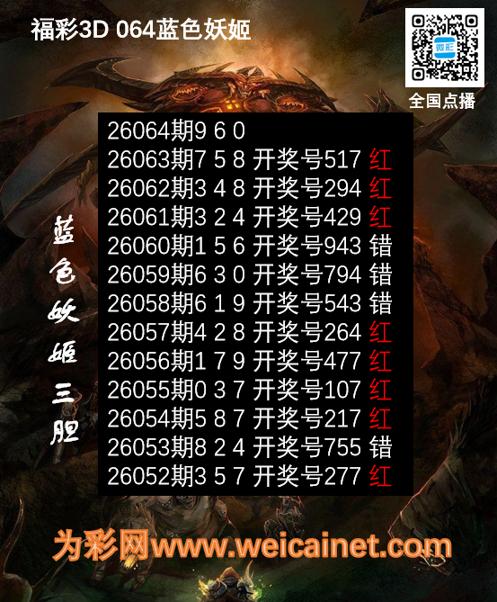 • 福彩3D26064期胆码 蓝色妖姬胆码图