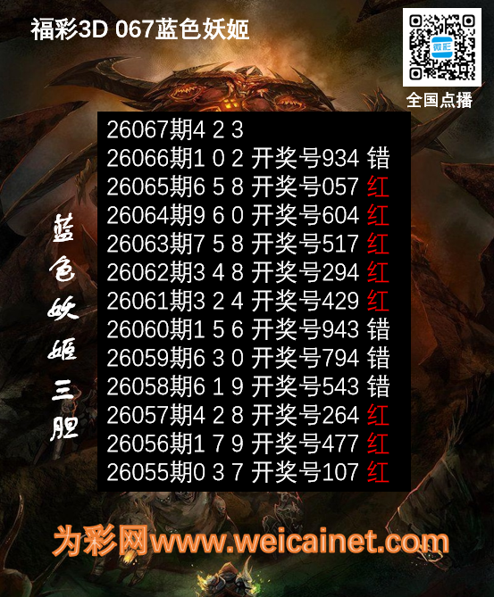 • 福彩3D26067期胆码 蓝色妖姬胆码图
