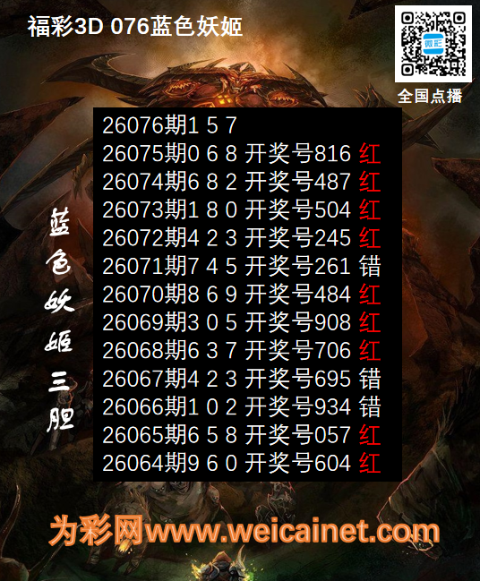 • 福彩3D26076期胆码 蓝色妖姬胆码图
