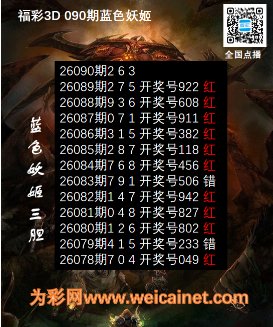 • 福彩3D26090期胆码 蓝色妖姬胆码图