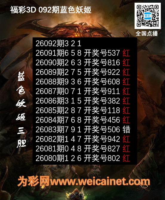 • 福彩3D26092期胆码 蓝色妖姬胆码图
