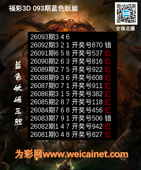 • 福彩3D26093期胆码 蓝色妖姬胆码图