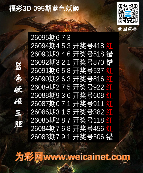 • 福彩3D26095期胆码 蓝色妖姬胆码图