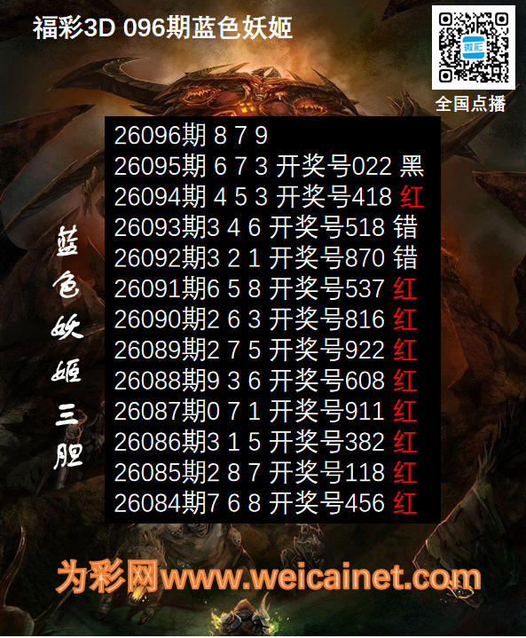 • 福彩3D26095期胆码 蓝色妖姬胆码图
