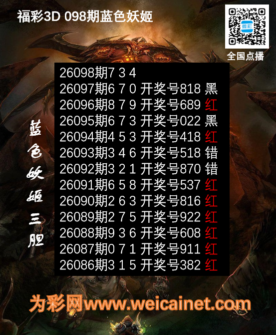 • 福彩3D26098期胆码 蓝色妖姬胆码图