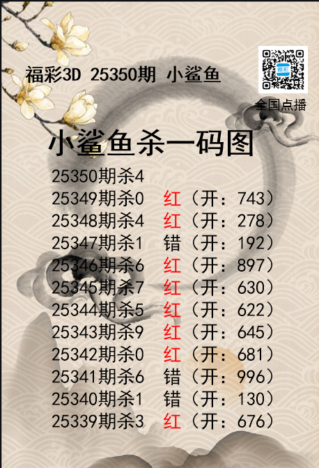 • 福彩3D25350期分析师小鲨鱼杀号图精