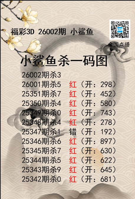 • 福彩3D26025期分析师小鲨鱼杀号图精选