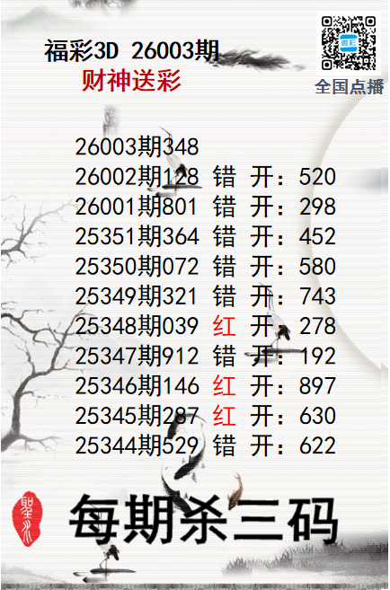 • 福彩3D26003期财神送彩杀三码