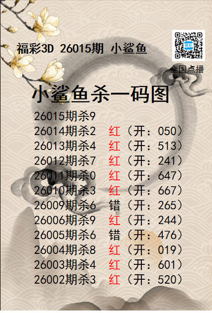 • 福彩3D26015期分析师小鲨鱼杀号图精