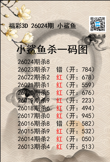 • 福彩3D26024期分析师小鲨鱼杀号图精选