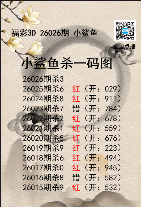 • 福彩3D26026期分析师小鲨鱼杀号图精选