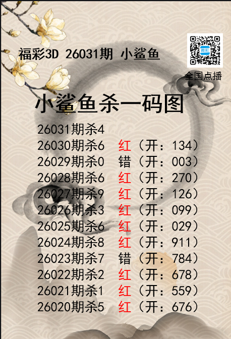 • 福彩3D26031期分析师小鲨鱼杀号图精选