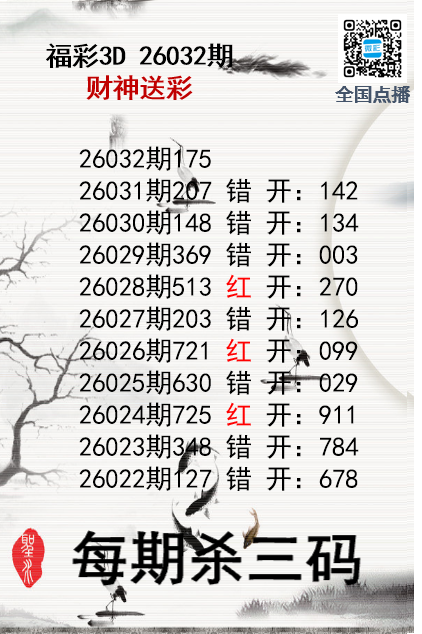 • 福彩3D26032期财神送彩杀三码