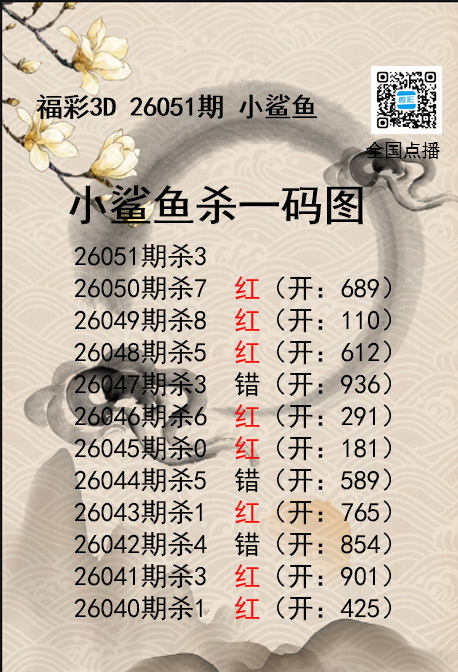 • 福彩3D26051期分析师小鲨鱼杀号图精选
