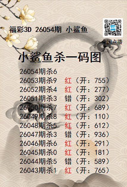 • 福彩3D26054期分析师小鲨鱼杀号图精选