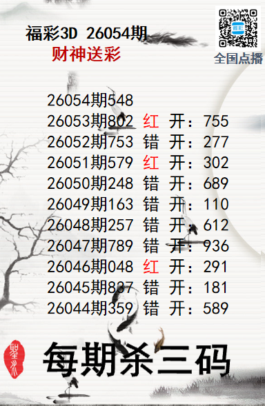 • 福彩3D26054期财神送彩杀三码