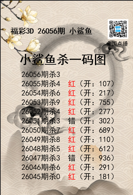 • 福彩3D26056期分析师小鲨鱼杀号图精选
