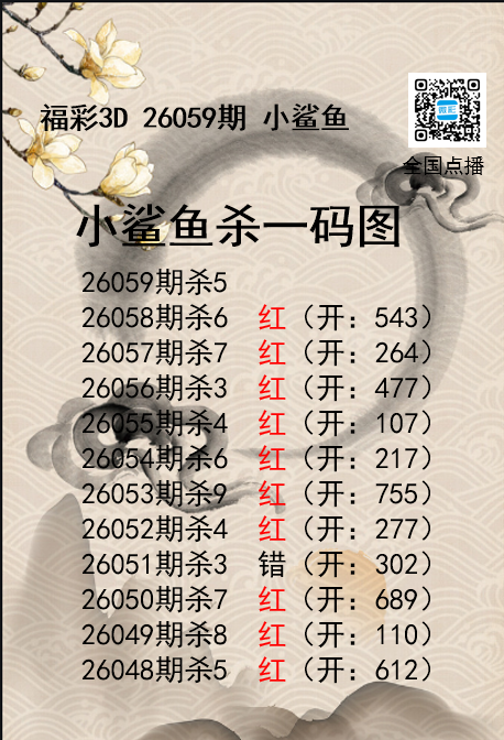 • 福彩3D26059期分析师小鲨鱼杀号图精选