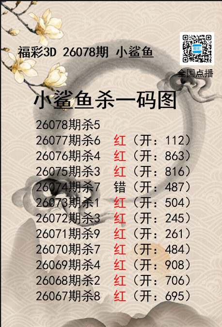 • 福彩3D26078期分析师小鲨鱼杀号图精选