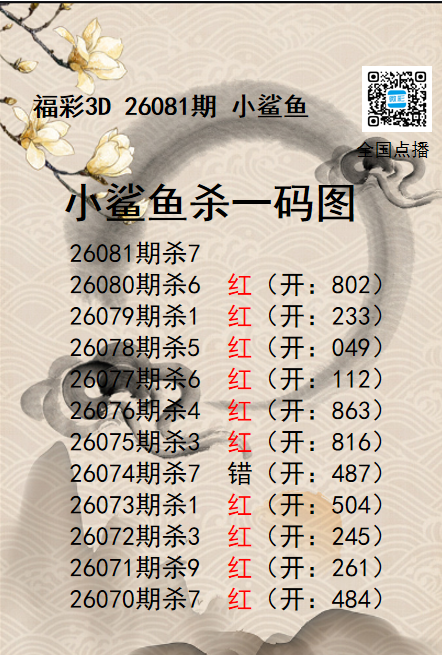 • 福彩3D26080期分析师小鲨鱼杀号图精选