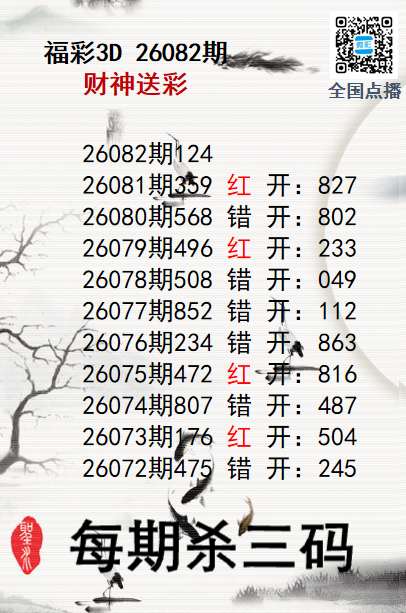 • 福彩3D26082期分析师小鲨鱼杀号图精选