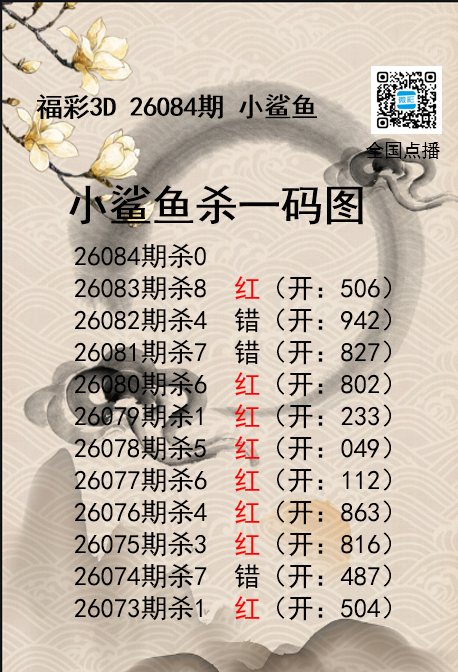 • 福彩3D26084期分析师小鲨鱼杀号图精选