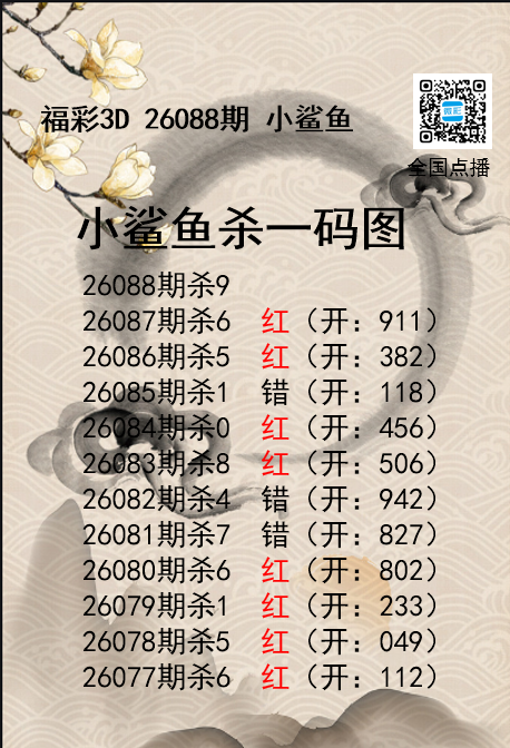 • 福彩3D26088期分析师小鲨鱼杀号图精选
