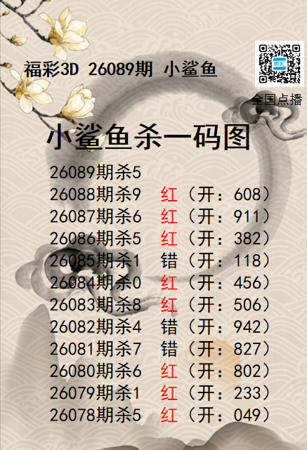 • 福彩3D26089期分析师小鲨鱼杀号图精选
