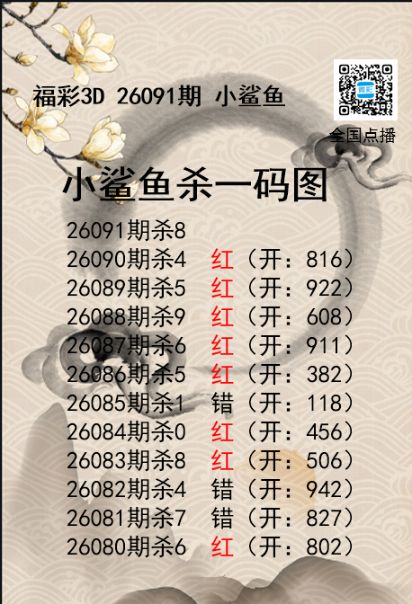 • 福彩3D26091期分析师小鲨鱼杀号图精选