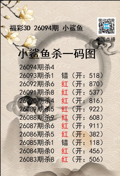 • 福彩3D26094期分析师小鲨鱼杀号图精选