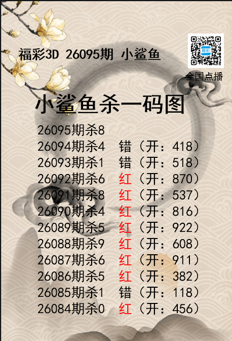 • 福彩3D26095期分析师小鲨鱼杀号图精选