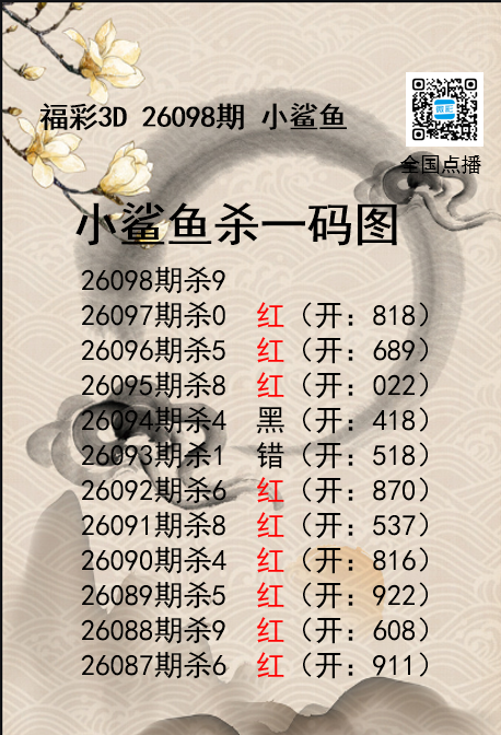 • 福彩3D26098期分析师小鲨鱼杀号图精选