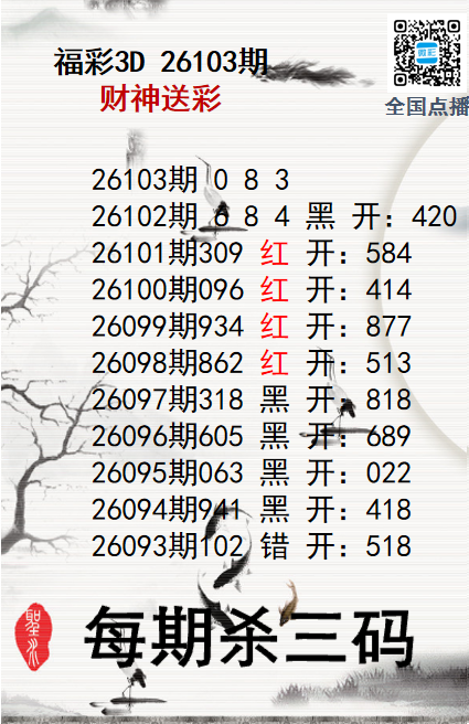 • 福彩3D26103期分析师小鲨鱼杀号图精选