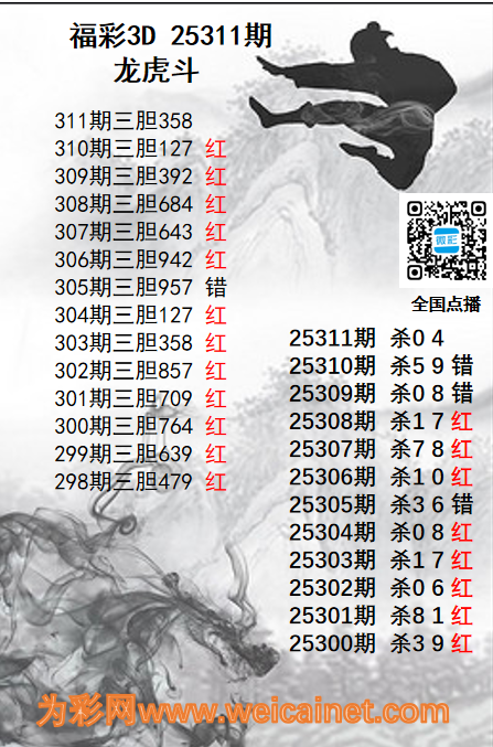 • 福彩3D25311期龙虎斗胆码 杀码图