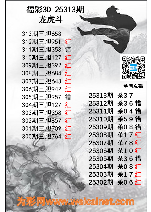 • 福彩3D25313期龙虎斗胆码 杀码图