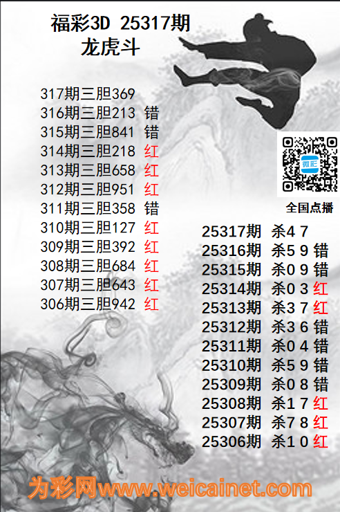 • 福彩3D25317期龙虎斗胆码 杀码图