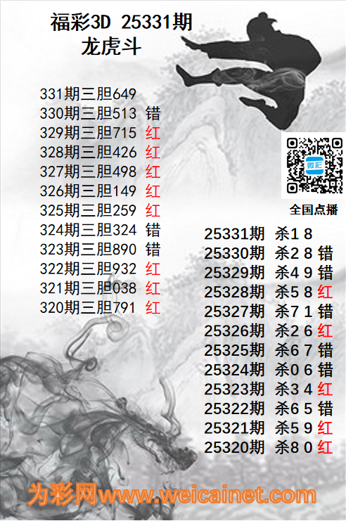 • 福彩3D25331期龙虎斗胆码 杀码图