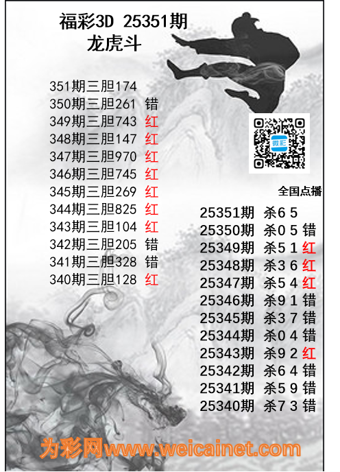• 福彩3D25351期龙虎斗胆码 杀码图