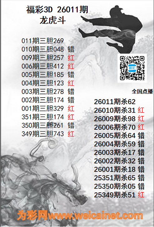 • 福彩3D26026期龙虎斗胆码 杀码图