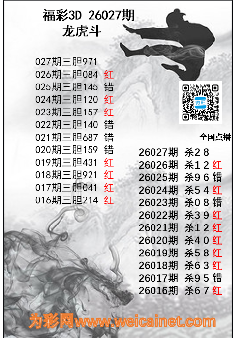 • 福彩3D26027期龙虎斗胆码 杀码图