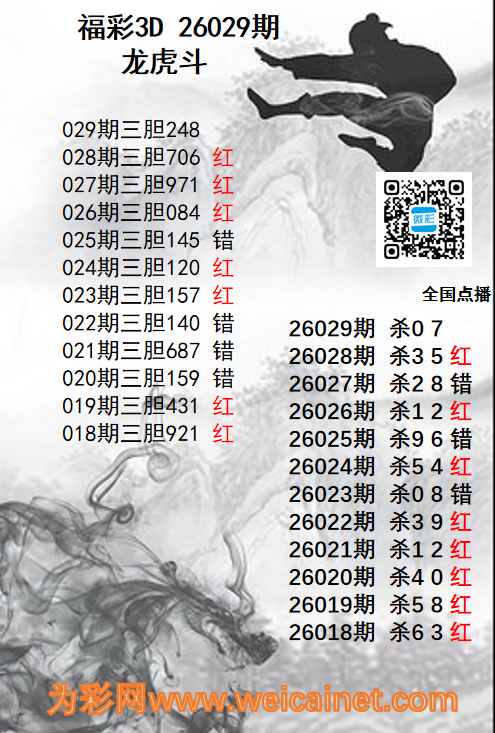 • 福彩3D26024期龙虎斗胆码 杀码图